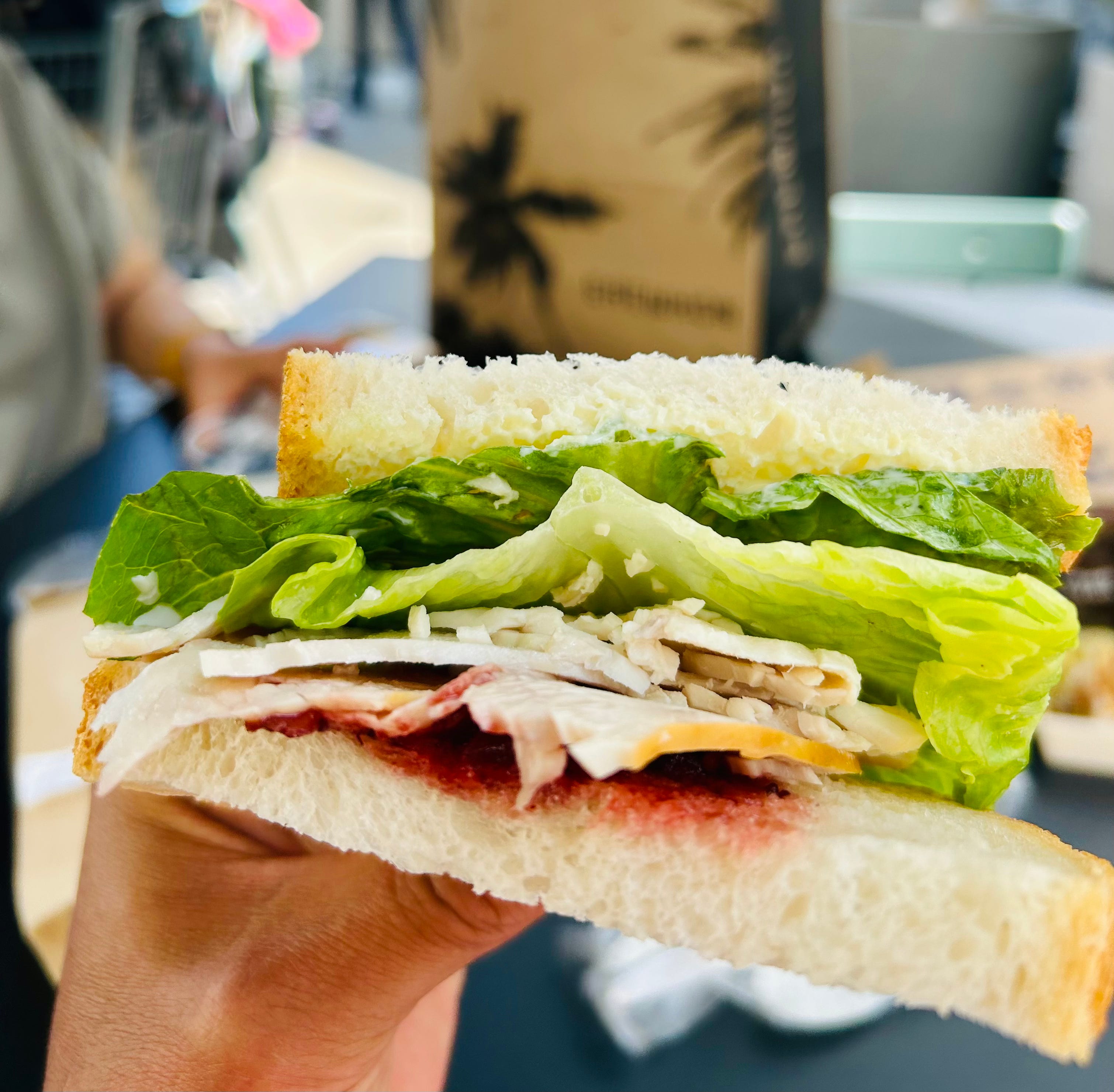 I people-watched while eating the worst sandwich of my entire life in the Erewhon patio. The sandwich, comprised of a few turkey slices, a glob of cranberry sauce, red leaf lettuce, and a whisper of soy mayonnaise, was $18.