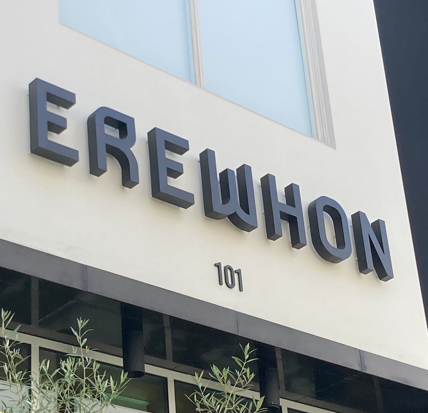 It feels big (it is not that big). The facades are blinding white. The storeâs sign is a stark black customized font based on Barlow. And the name is an anagram of the word Nowhere; Erewhon is almost nowhere spelled backward. Why they didnât go full bore and spell it Erehwon is beyond me.